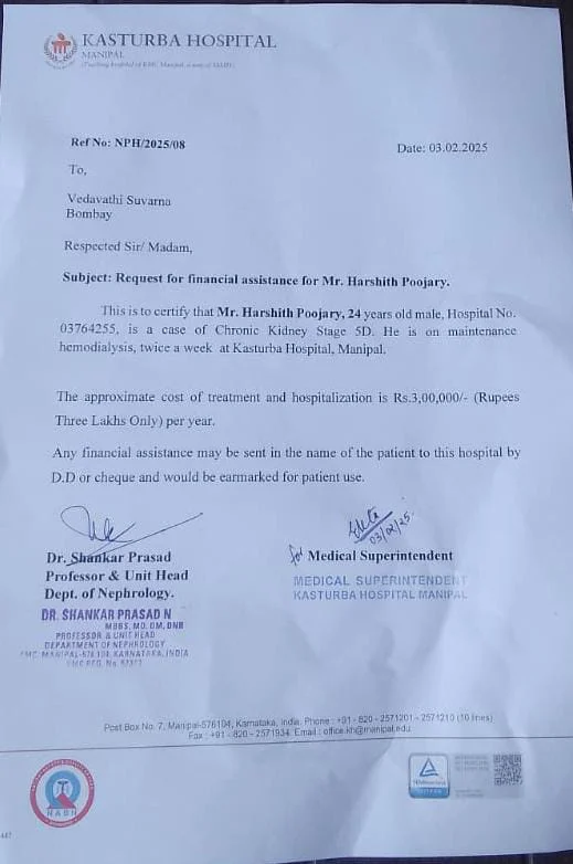 We urgently seek your support for Harshith Poojary, a 22-year-old battling Chronic Kidney Disease (Stage 5D). His condition requires life saving Hemodialysis twice a week at Kasturba Hospital, Manipal, and the estimated treatment cost is ₹5,00,000.